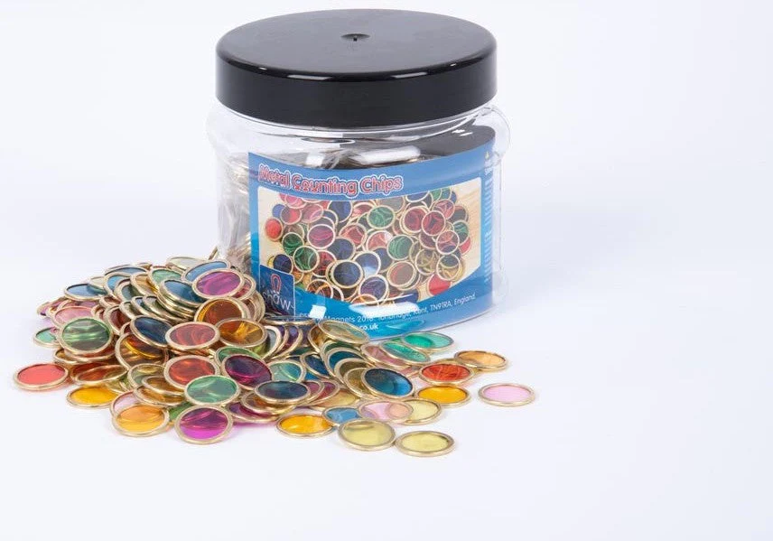 Colourful transparent discs with metal rims ideal for use with magnets. Great for counting, sorting and for using on a light panel to learn about colour.